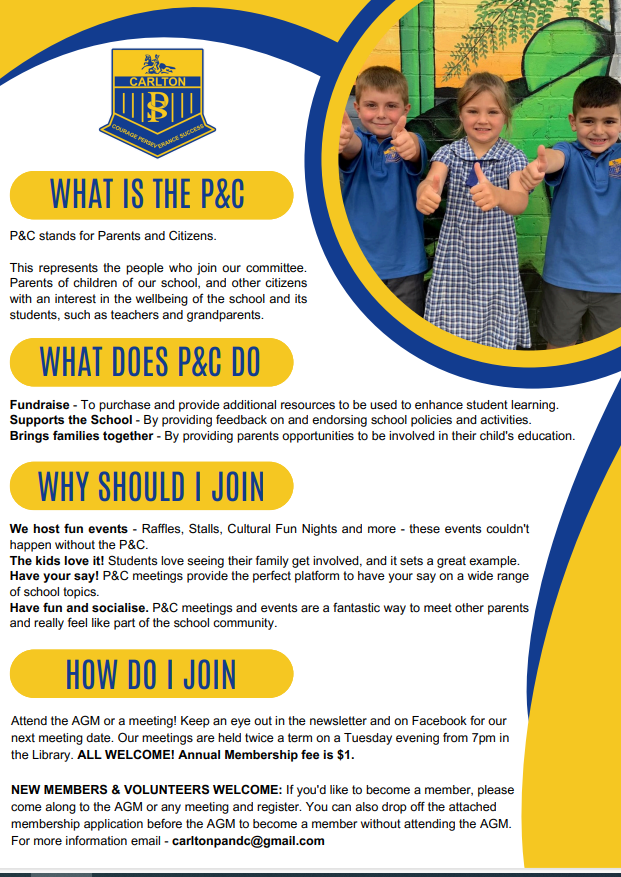 Carlton Public School has an active Parents & Citizens' Association. Meetings are held at 7:00 on Tuesdays in the twice a term. All parents are welcome to attend to find out what's happening at school and support their child's education.